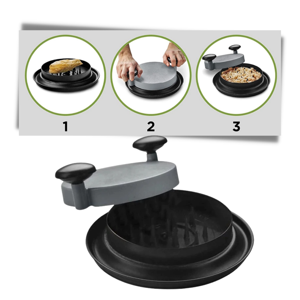 This shred machine with plastic teeth on top and bottom will save you time and effort as it’s designed to shred your meat in a matter of minutes. It’s really easy to use. First, place the meat in the chamber. Then, set down the lid. Next, make a few half rotations using the comfortable handles and that’s it - your shredded meat is ready!