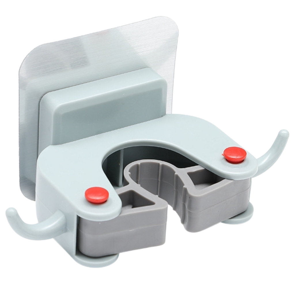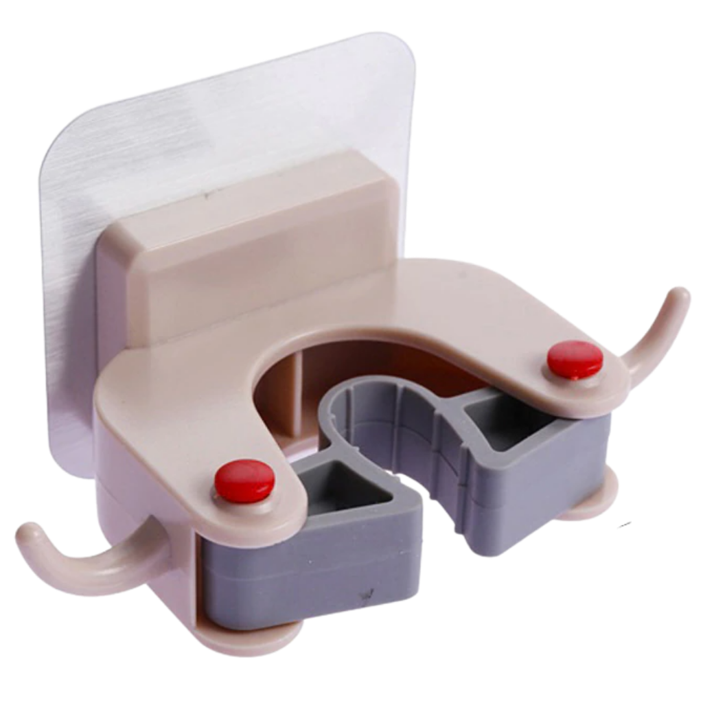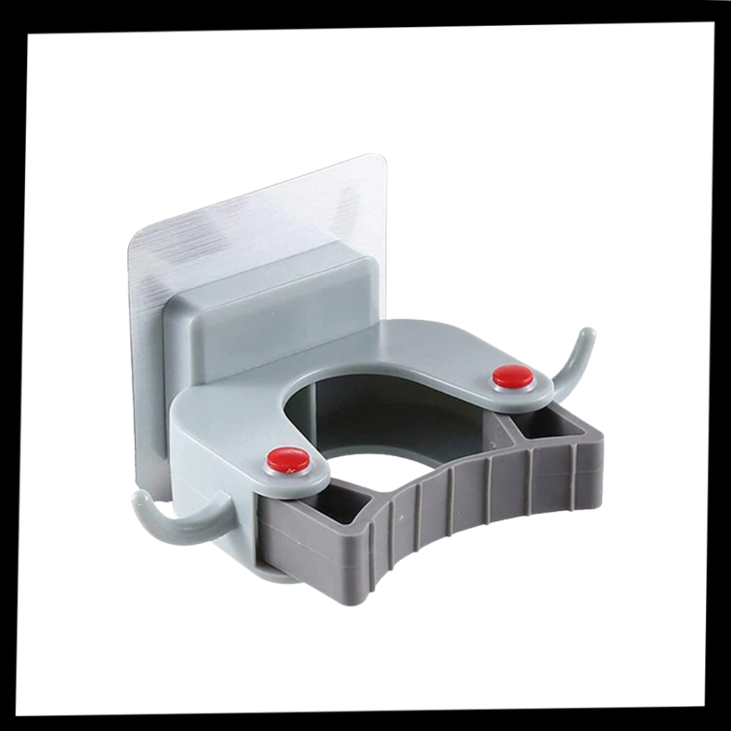 Get your cleaning gear organised with this adhesive broom holder! Mount it on a wall to hang your broom or mop up for easy access.
